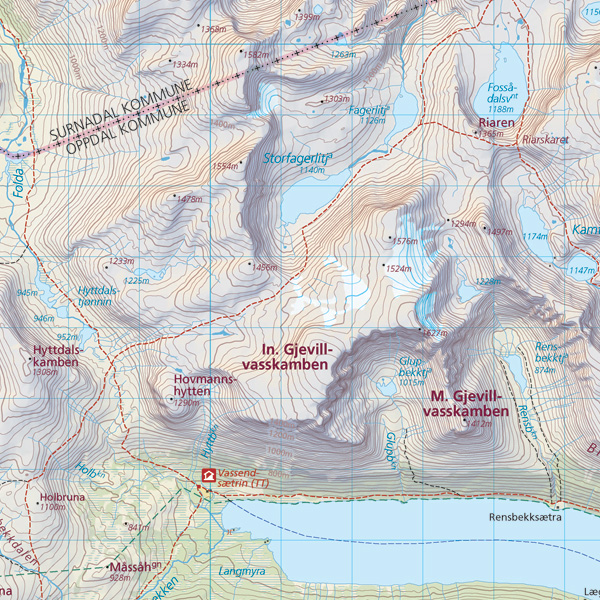 Terrengformen fremheves med en fjellskygge slik at uerfarne brukere får «hjelp» til å forstå høydekurvene og terrenget. Skyggen legges på forsiktig slik at lesbarheten bevares også i skyggepartier. Vi ønsker ikke bare at kartet skal være pent å se på; det skal også være funksjonelt.
